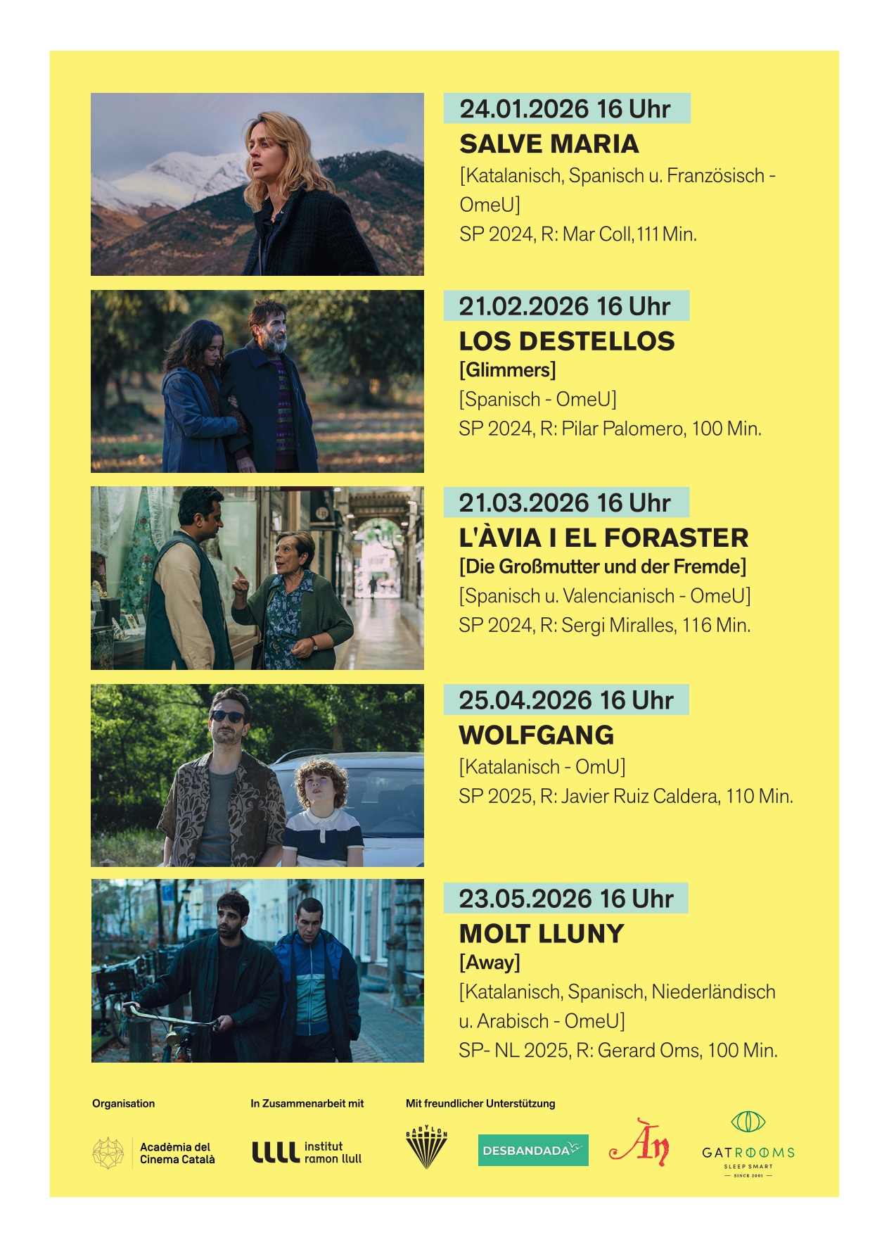 Wir freuen uns darauf, Sie einmal im Monat samstags ab 16 Uhr begrüßen zu dürfen, um gemeinsam die Filme, Gespräche und die katalanische Gastronomie zu genießen.