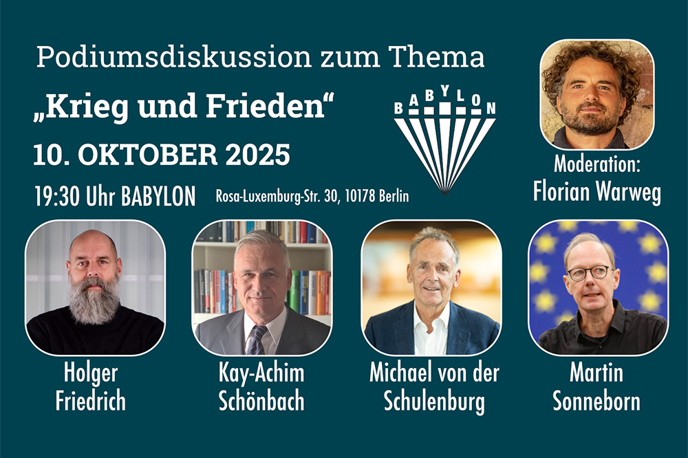 Der Verleger der Berliner Zeitung Holger Friedrich, der Vizeadmiral a. D. der Deutschen Marine der Bundeswehr Kay-Achim Schönbach, Michael von der Schulenburg und Martin Sonneborn, beide Mitglieder des Europäischen Parlaments, diskutieren aktuelle Fragen zu den großen politischen Entwicklungen der heutigen Zeit. Florian Warweg, Journalist für die NachDenkSeiten in der Bundespressekonferenz, wird die Podiumsdiskussion moderieren.